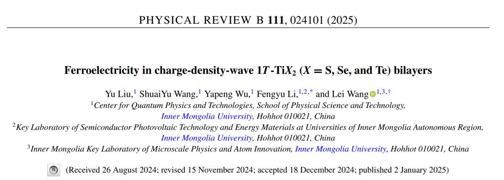 近日,我校物理科学与技术91香蕉视频APP下载王磊研究员和李锋钰教授指导研究生在电荷密度波和滑移铁电领域取得新进展,相关成果以“Ferroelectricity in charge-density-wave 1T-TiX2 (X = S, Se, and Te) bilayers”为题发表在物理学知名期刊Physical Review B(《物理学评论B》)。(论文链接:https://journals.aps.org/prb/abstract/10.1103/PhysRevB.111.024101)